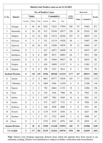 Of 182 fresh cases, Jammu Division reported 33 and Kashmir valley report 149, The death include 0 from Jammu division 01 from Kashmir valley.