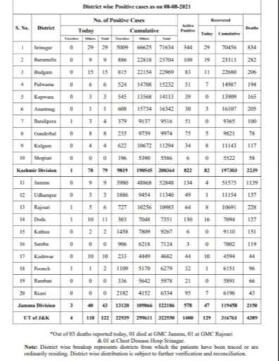 Of 122 fresh cases, Jammu Division reported 43  and Kashmir valley 79, The death include 02 from Jammu division 01 from Kashmir valley.