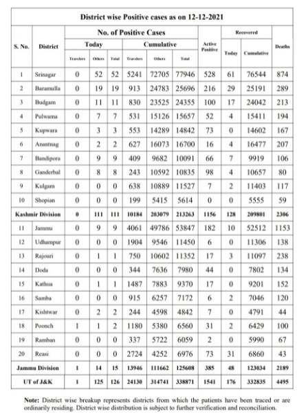 Of 126 fresh cases, Jammu Division reported 15 and Kashmir valley report 111, The death include 0 from Jammu division 04 from Kashmir valley.