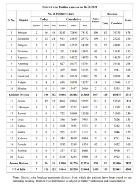 133 fresh cases, Jammu Division reported 31 and Kashmir valley report 102, The death include 01 from Jammu division 04 from Kashmir valley.