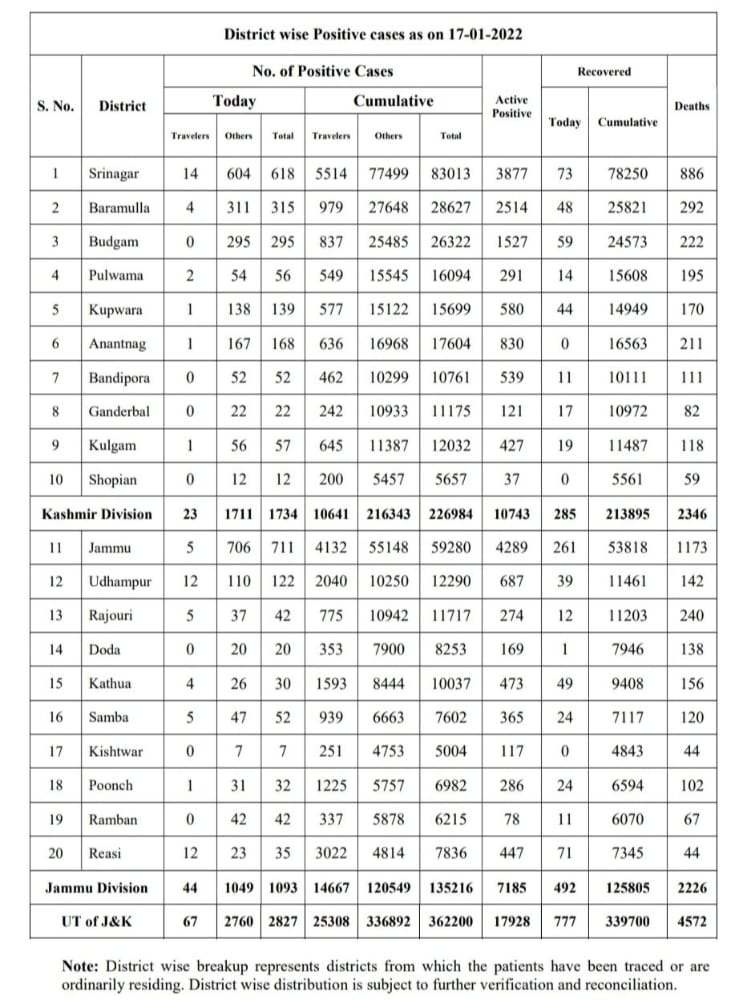 2827 fresh cases, Jammu Division reported 1093 and Kashmir valley report 1734, The death include 05 from Jammu division 0 from Kashmir valley.