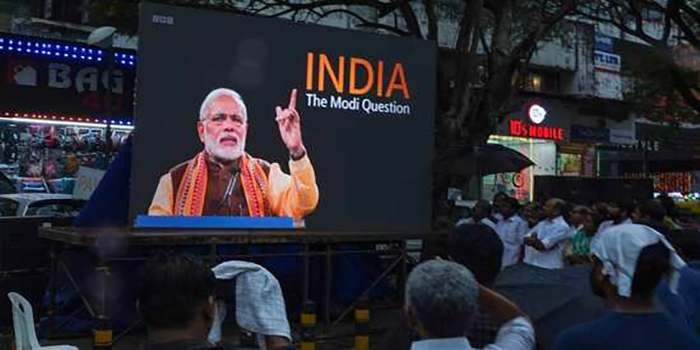 People watch the BBC documentary “India: The Modi Question”, on a screen installed at the Marine Drive junction under the…