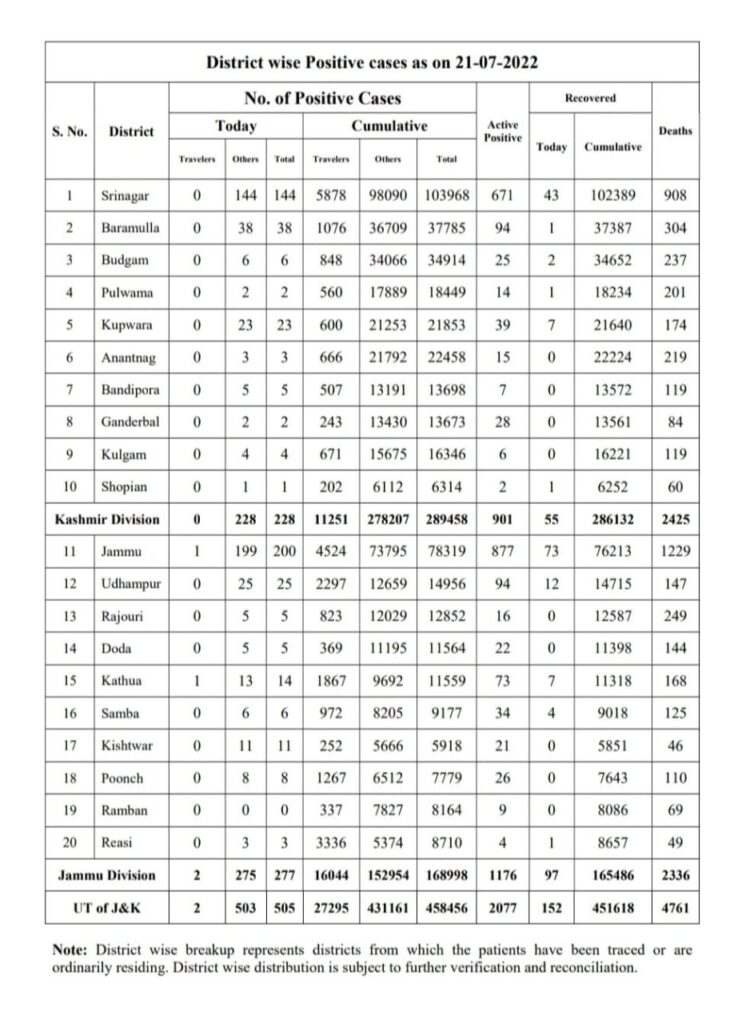 505 new positive cases have been reported, 277 from Jammu Division and 228 from