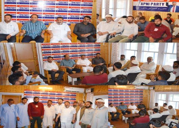 Apni Party President Syed Mohammad Altaf Bukhari on Wednesday held a meeting with several delegations from Pampore constituency. Members from Auqaf Committee, Youth Club, Stone Quarry Association and Irrigation Department were present during the meeting. The delegation was led by Chairman Block Development Council Pampore Mir Altaf.