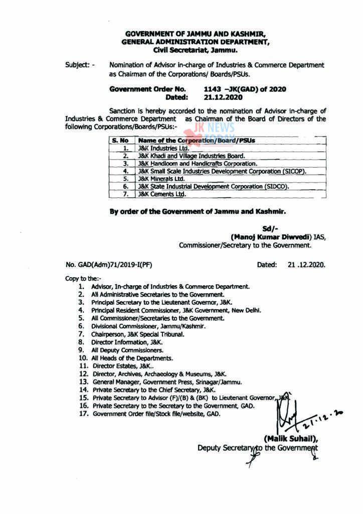 Baseer Khan, Advisor to the Jammu and Kashmir Lt. Governor, incharge of the Industries and Commerce department has been nominated as Chairman of the Board of Directors various industries related boards , corporations and PSUs.
