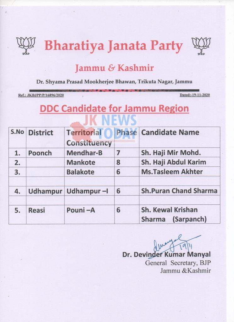 J&K BJP General Secretary Dr. Devinder Kumar Manyal in consultation with party President Ravinder Raina, General Secretary (Org.) Ashok Kaul and other senior party leaders made the announcement for the names of party leaders who are entrusted with party’s mandate for the 6th, 7th and 8th Phases of DDC Elections.In the 5th list of candidates, BJP announced 05 candidates for DDC elections in Jammu region.
