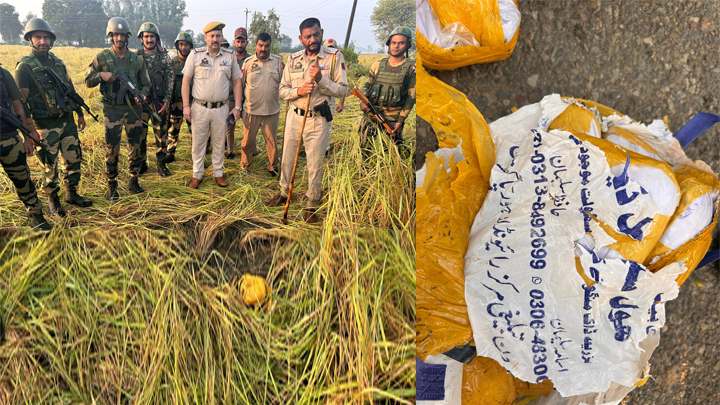 During a search operation launched in the morning hours of 27 October 2025 near Village Bidipur, R.S. Pura, Jammu, alert BSF personnel recovered two yellow-coloured packets (containing 10 small packets wrapped within them) weighing approximately 5.300 kg. Suspected contraband was recovered from farmland near Village Bidipur, R.S. Pura, Jammu. The substance is suspected to be Heroin, appears to have been drone-dropped from across the border. A thorough search of the area is ongoing. Police has been called to take further necessary action.