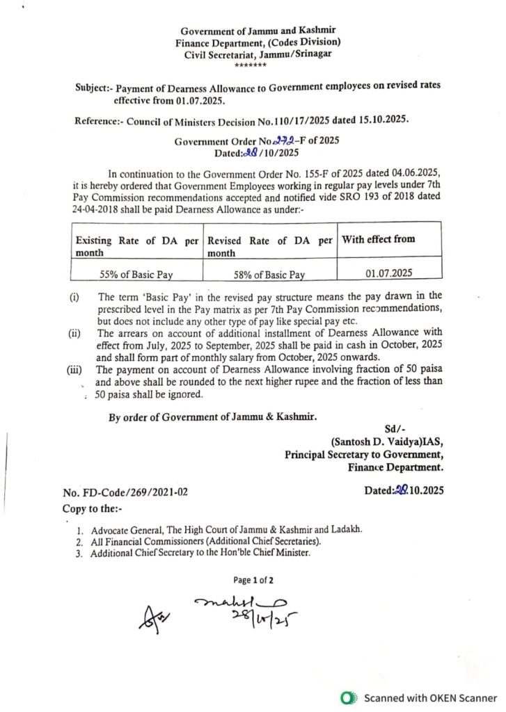 JK News Today DA for government employees on revised rates Post navigation Jammu & Kashmir Engineer Service Forum Welcomes Historic Cabinet Decision on Engineer Cadre Reforms. Chief Secy reviews progress on end-to-end digitization of Recruitment Rules