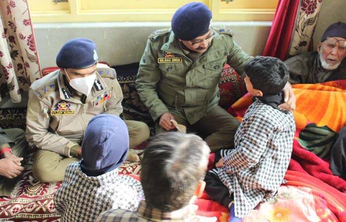 Director General of Police J&K Dilbag Singh today visited the families of martyr Police SgConstable Mohd Sultan & Constable Fayaz Ahmad who attained martyrdom on 10th of December 2021 in a terrorist attack at Gulshan Chowk in Bandipora Town of North Kashmir.
