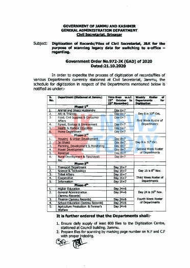 In order to expedite the process of digitization of records files of various Departments currently stationed at Civil Secretariat, Jammu, theschedule for digitization in respect of the Departments mentioned below is notified as per the order attached.