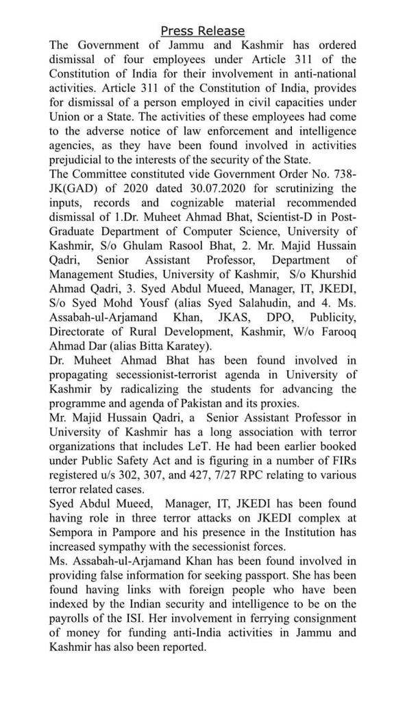 Four government employees, including Bitta Karate wife and a scientist-D at Kashmir University, were dismissed for service for terror links. Assabah Arzoomand Khan, wife of top JKLF terrorist Farooq Ahmed Dar alias Bitta Karate is a 2011 batch JKAS officer, Muheet Ahmad Bhat, Scientist-D is working with Kashmir University, Majid Hussain Qadri, Sr. Asst Professor, Kashmir University and Syed Abdul Mueed, Manager IT, JKEDI were removed by invoking Article 311 of the Constitution of India.