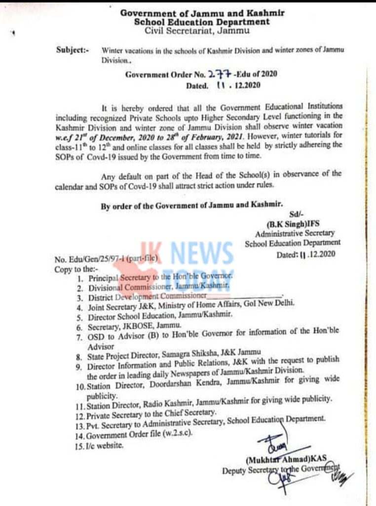 The government on Friday declared winter vacations for schools in Kashmir from December 21.This schedule of work tee vacations will apply for winter zone of Jammu region, an order issued by the Government said.