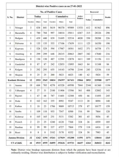 4959 fresh cases, Jammu Division reported 1394 and Kashmir valley report 3565, The death include 01 from Jammu division 06 from Kashmir valley.