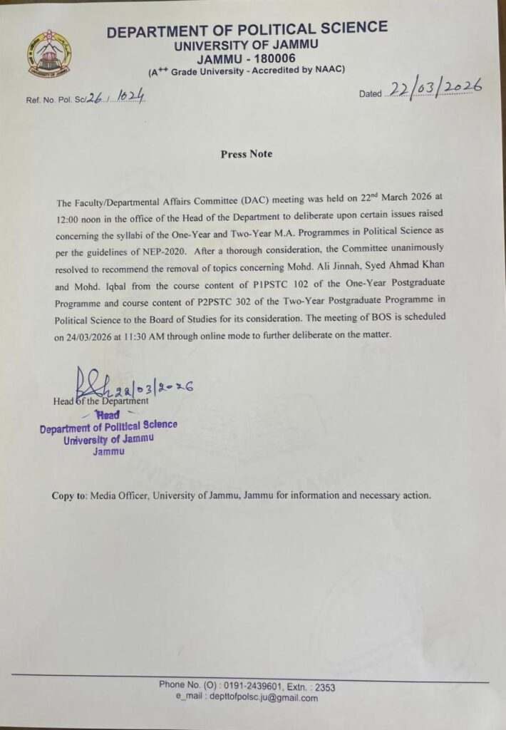 Jammu University removes chapter on Mohammad Ali Jinnah from political science Post graduation course