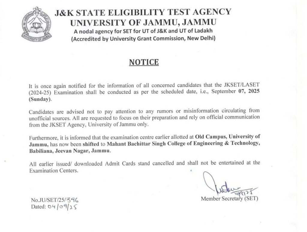 JK News Today JU to go ahead with SET exam on Sunday- Venue changed Post navigation JU to Hold SET Exams on September 7 Despite Bad Weather, Student Opposition Sakina Ittoo announces opening of schools on Monday – September 8