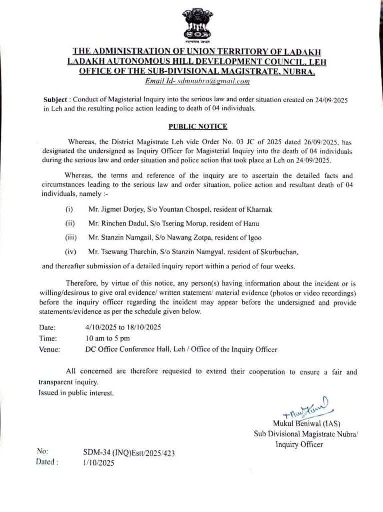Ladakh UT administration orders magisterial probe into September 24 incidents