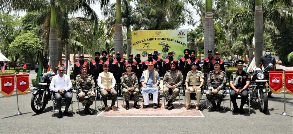 Lieutenant Governor of Jammu & Kashmir Manoj Sinha alongwith Lt Gen Upendra Dwivedi, GOC-in-C Northern Command Flagged In the Veer Smriti Motor Cycle rally and greeted all ranks of Indian Army’s White Knight Corps on its 50th raising day in a traditional ceremony at Nagrota Military Station, today.