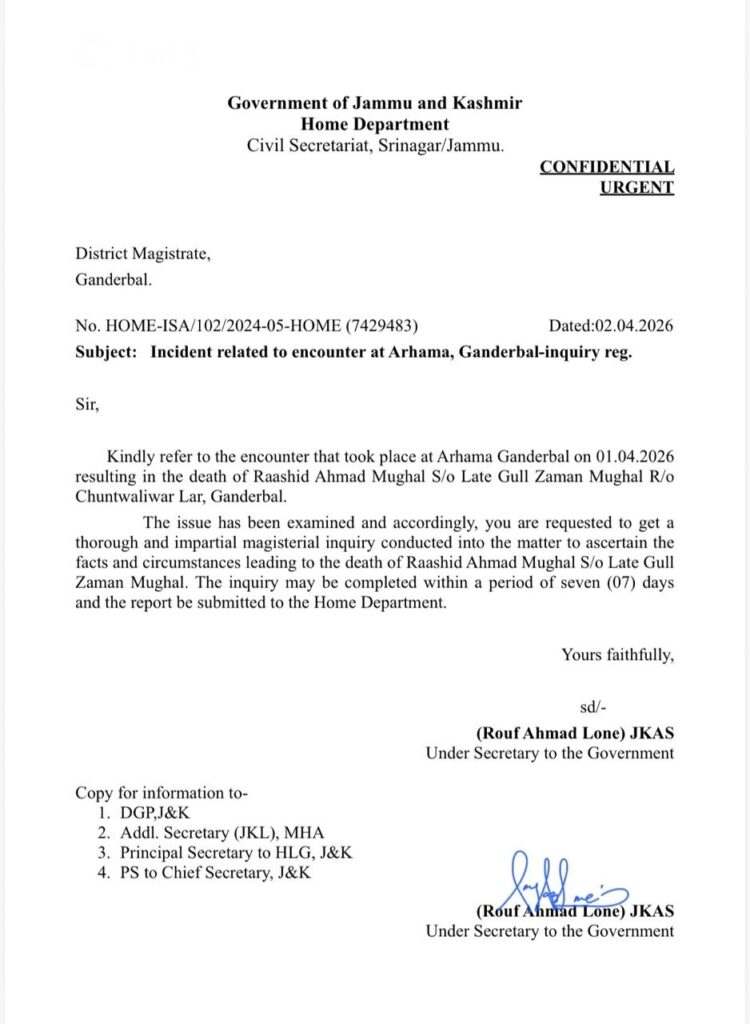 Srinagar, April 03, 2026: LG Sinha orders Magisterial Inquiry into Ganderbal encounter. Sharing an order copy on social handle X, LG Sinha said, “I have ordered a thorough and impartial magisterial inquiry into Arhama, Ganderbal incident. The inquiry will examine all aspects related to the incident and ensure that justice is served.”