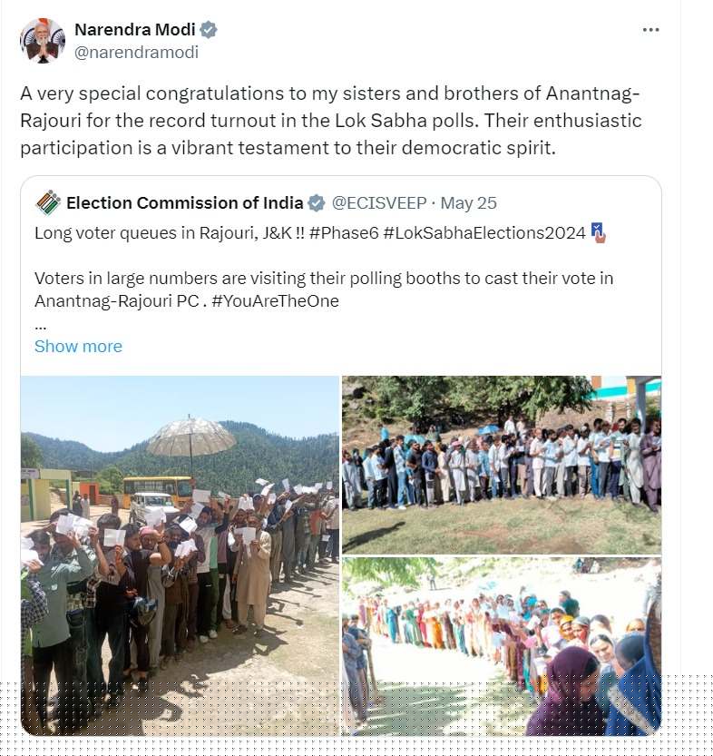 Jammu, May 27: Prime Minister Narendra Modi complimented voters of Anantnag- Rajouri for huge turnout and termed it as a testament to their vibrant democratic spirit.