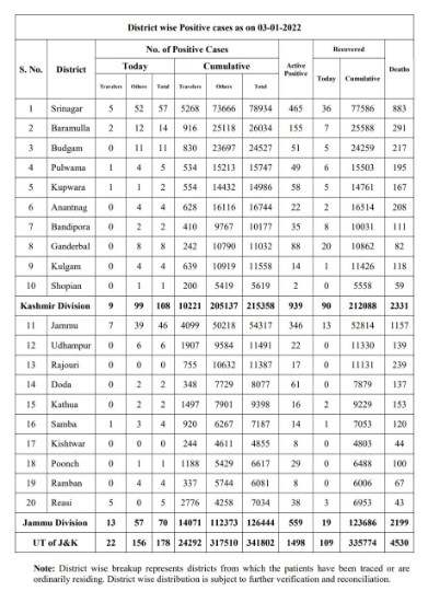 178 fresh cases, Jammu Division reported 70 and Kashmir valley report 108, The death include 0 from Jammu division 0 from Kashmir valley.