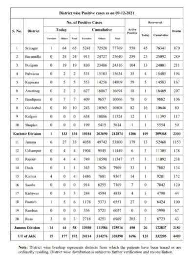 Of 192 fresh cases, Jammu Division reported 58 and Kashmir valley report 134, The death include 0 from Jammu division 0 from Kashmir valley.