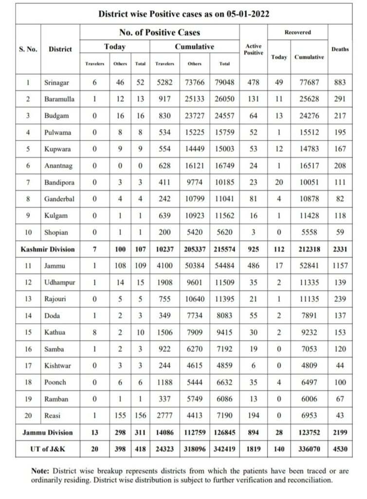 418 fresh cases, Jammu Division reported 311 and Kashmir valley report 107, The death include 0 from Jammu division 0 from Kashmir valley.