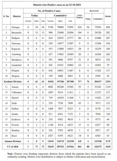 Of 72 fresh cases, Jammu Division reported 9 and Kashmir valley report 63, The death include 0 from Jammu division 0 from Kashmir valley.