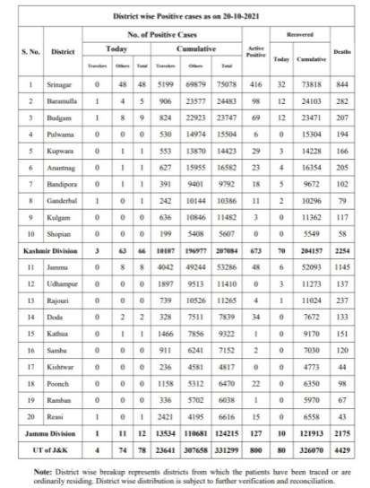 Of 78 fresh cases, Jammu Division reported 12 and Kashmir valley report 66, The death include 0 from Jammu division 0 from Kashmir valley.