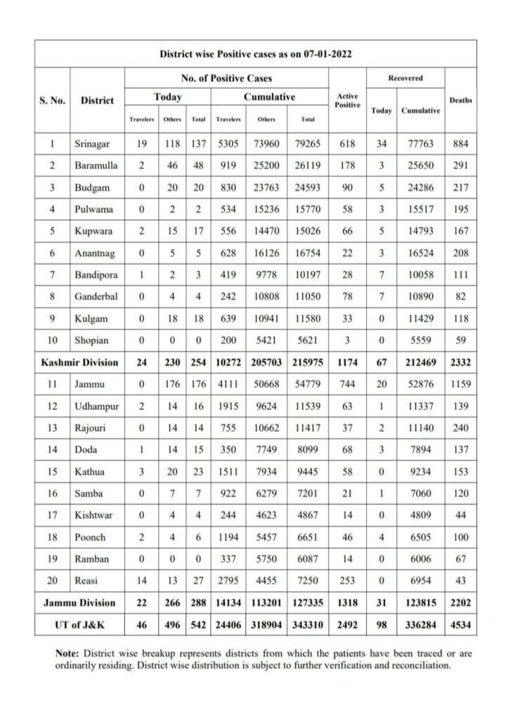 542 fresh cases, Jammu Division reported 288 and Kashmir valley report 254, The death include 01 from Jammu division 0 from Kashmir valley.