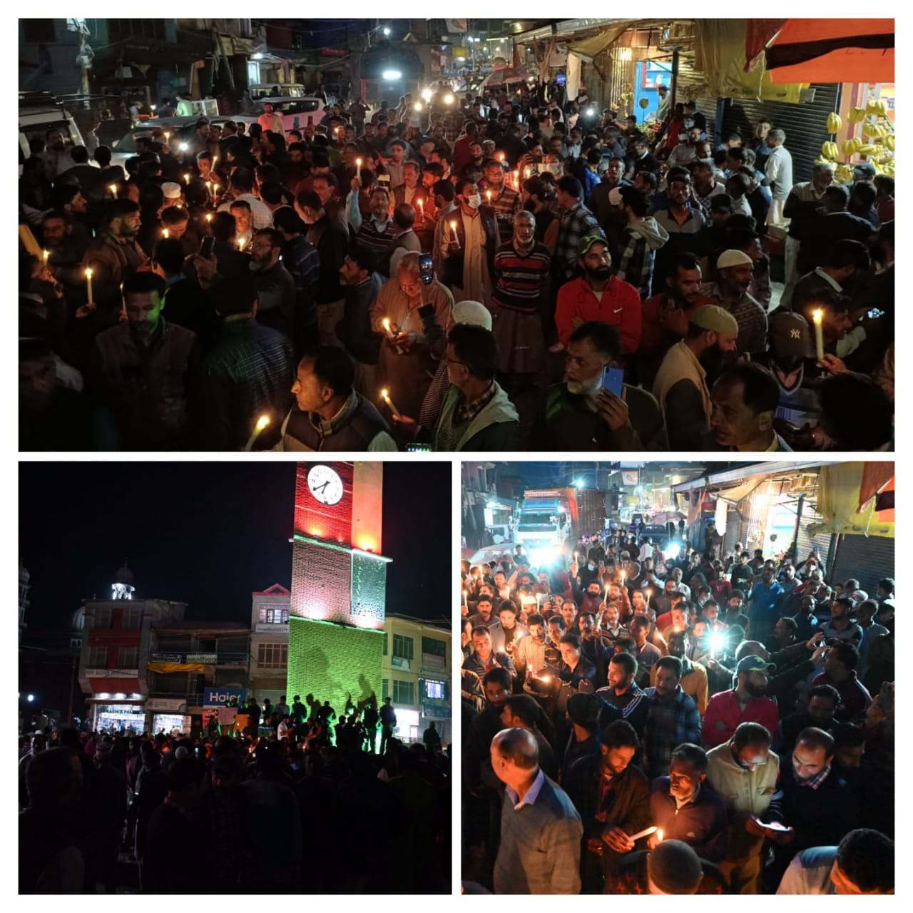 SHOPIAN, OCTOBER 16 : Peaceful demonstration and candlelight March was held tonight in Shopian district against the killing of Puran Krishan Bhat, a resident of the district.
