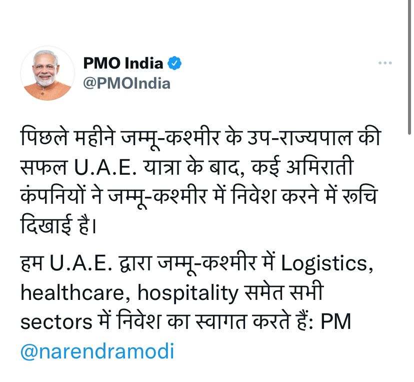 Prime Minister in a tweet noted the interest of the UAE companies and efforts of LG Sinha with a pointed appreciation as these would-be economic activities fit in his dream of turning J&K into an investment hub.