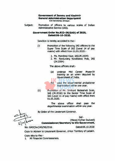 The Government of Jammu and Kashmir has ordered promotion of the following IAS officers to the Super Time Scale of IAS (Level 14 of pay