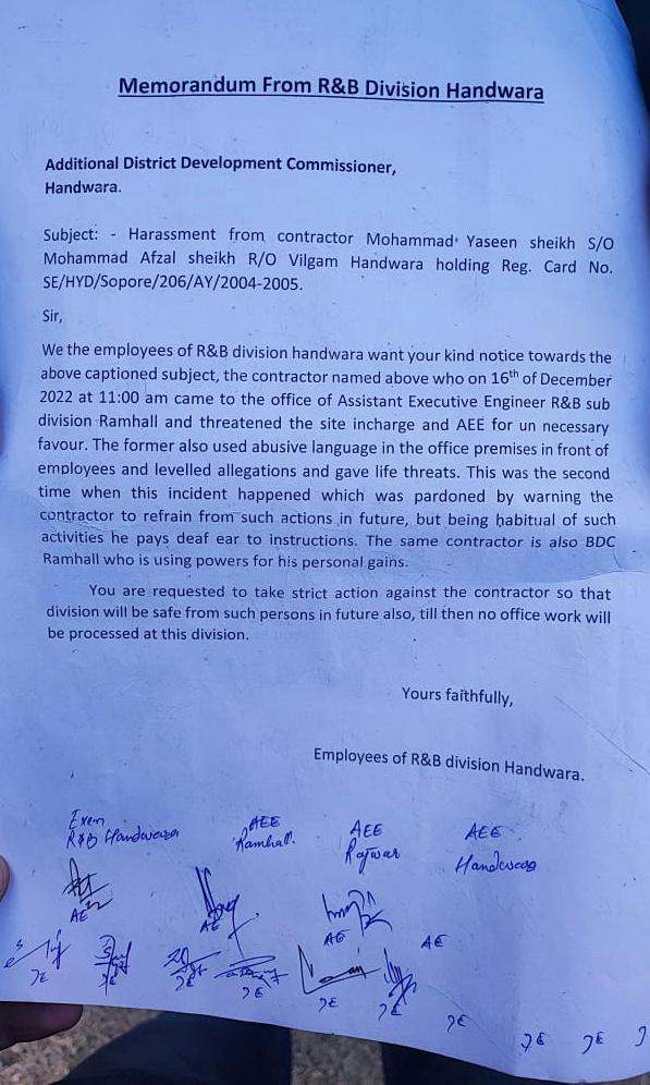 Following is the copy of complaint given by the engineers to ADDC of Handwara :