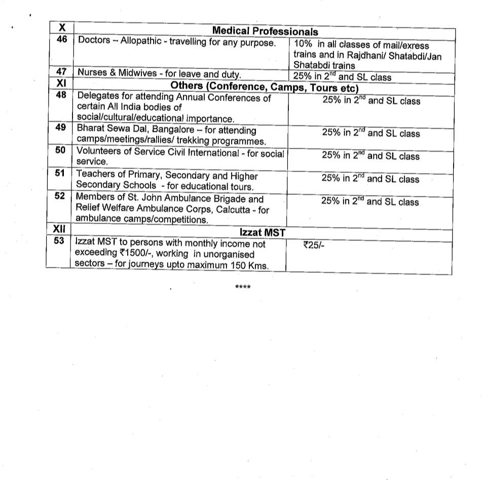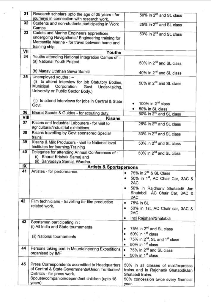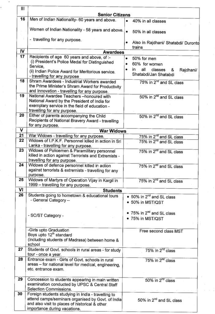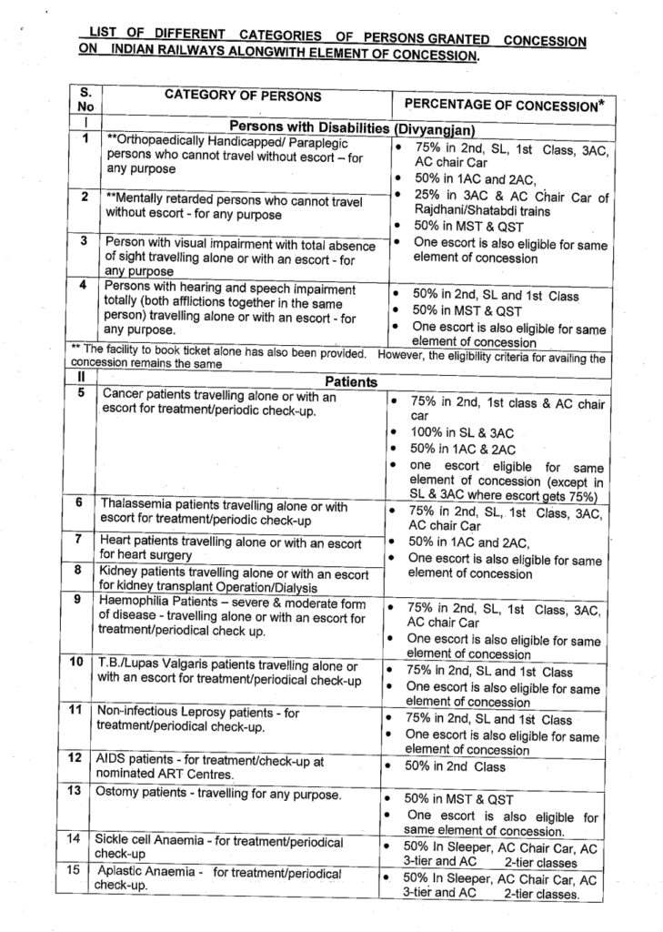 The Indian railways on Friday announced big concessions for various categories, handicapped, patients and senior citizens.