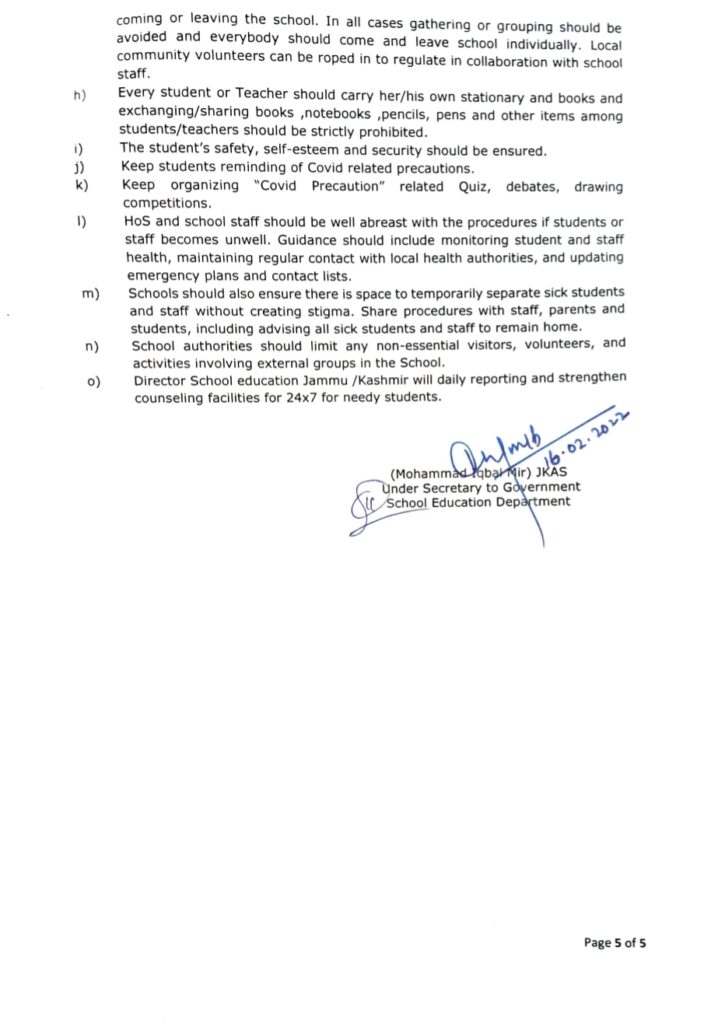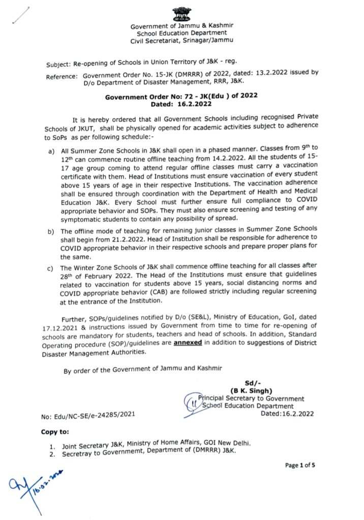 The Jammu and Kashmir government has issued guidelines to be followed regarding reopening of schools- both government and private
