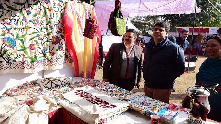 Various handicraft products handmade cushions, Suits, Kashmiri Shawls, Bed Sheets, Paper Machine, Crewel Embroidery Items, Sozni Embroidery Items, Jute Accessories, and Dry Fruits are being displayed in the exhibition stalls.