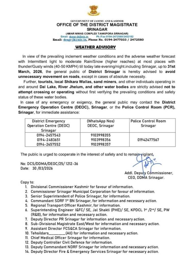 JK News Today Srinagar Deputy Commissioner issues advisory for locals and tourists for tomorrow Post navigation Budget Session 2026: Around 150 Principals, Lecturers, Teachers being detached to their original postings in School Education department: Sakeena Itoo LG suspends ADC Anantnag Sundeep Singh Bali pending inquiry