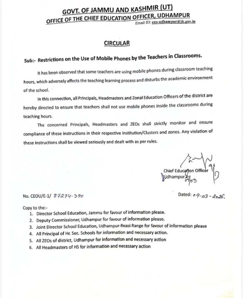 Teachers in Udhampur barred from using mobile phones in class rooms.