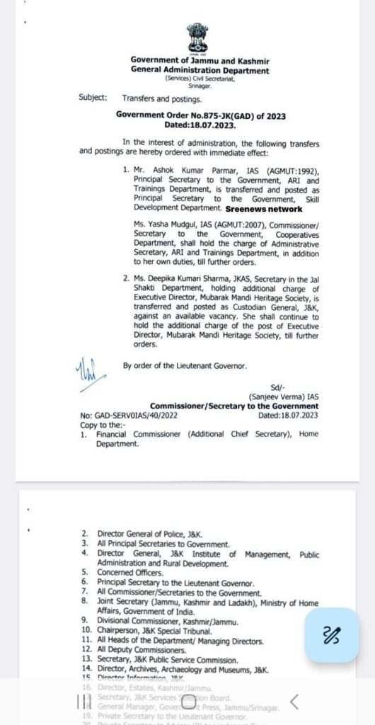JK News Today Srinagar, July 18 The Government has transferred two senior IAS officers and Ashok Parmar on Tuesday Post navigation After 30 years Shiv Temple in Kunzer Baramulla opens, special puja held Two Non-Locals Shot At, Injured In Anantnag, Both Stable: Police
